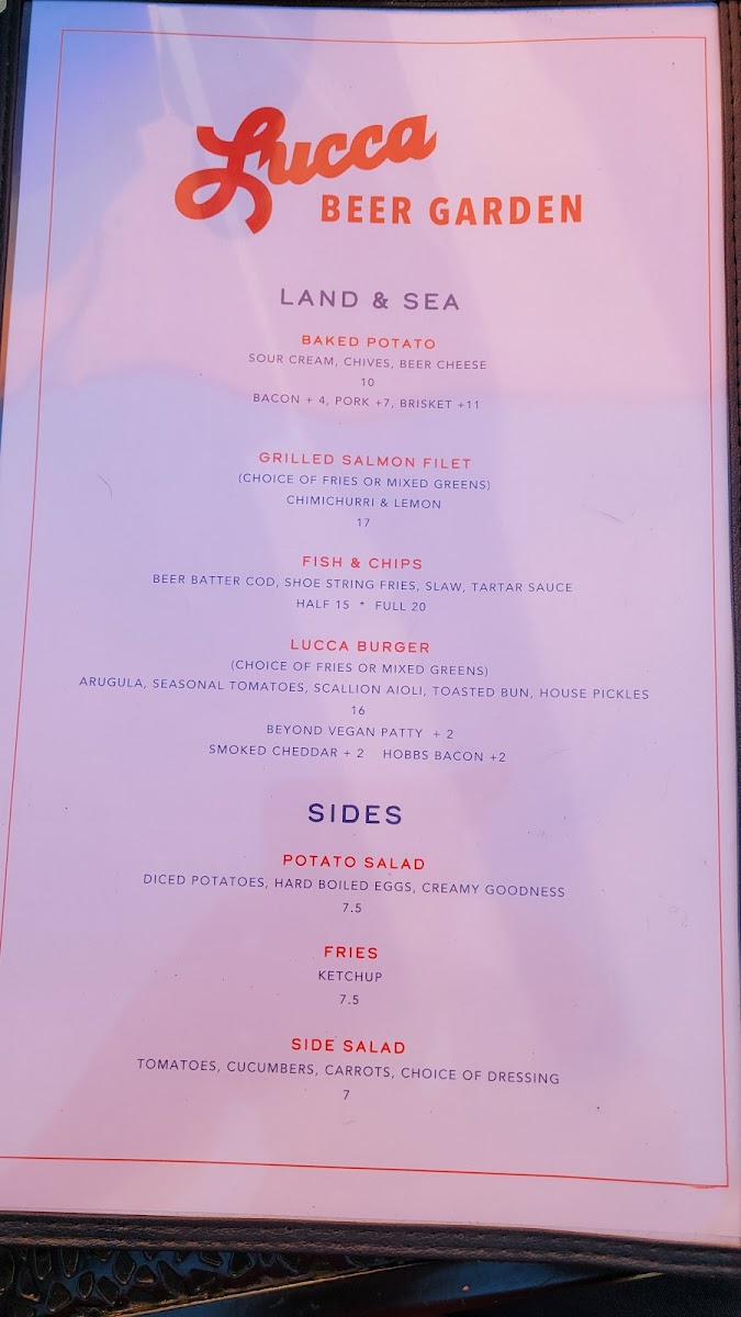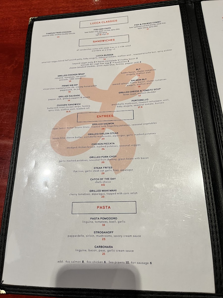 Sandwiches and Burgers: Options here include the Lucca Burger and Chicken Sandwich, providing classic American sandwich choices suitable for a quick meal or casual dining experience.